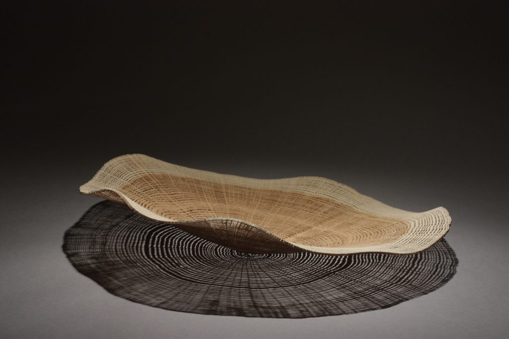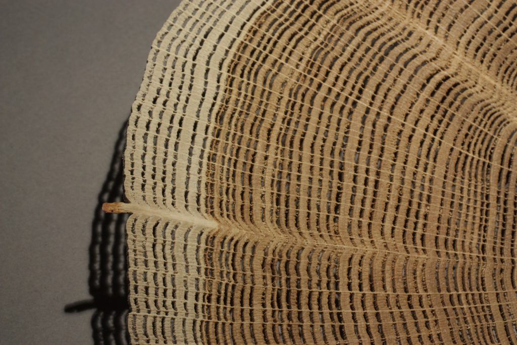 Ses créations naissent sur un tour à bois. Au départ, une pièce en chêne de plusieurs kilos qu’il façonne et transforme en une galette de 2 à 3 millimètres d‘épaisseur. Une prouesse en soi ! Vient ensuite l’étape du retrait par sablage au cours de laquelle l’artiste élimine les cernes de croissance de printemps, plus tendres, tout en préservant la structure la plus dense des cernes d’été.