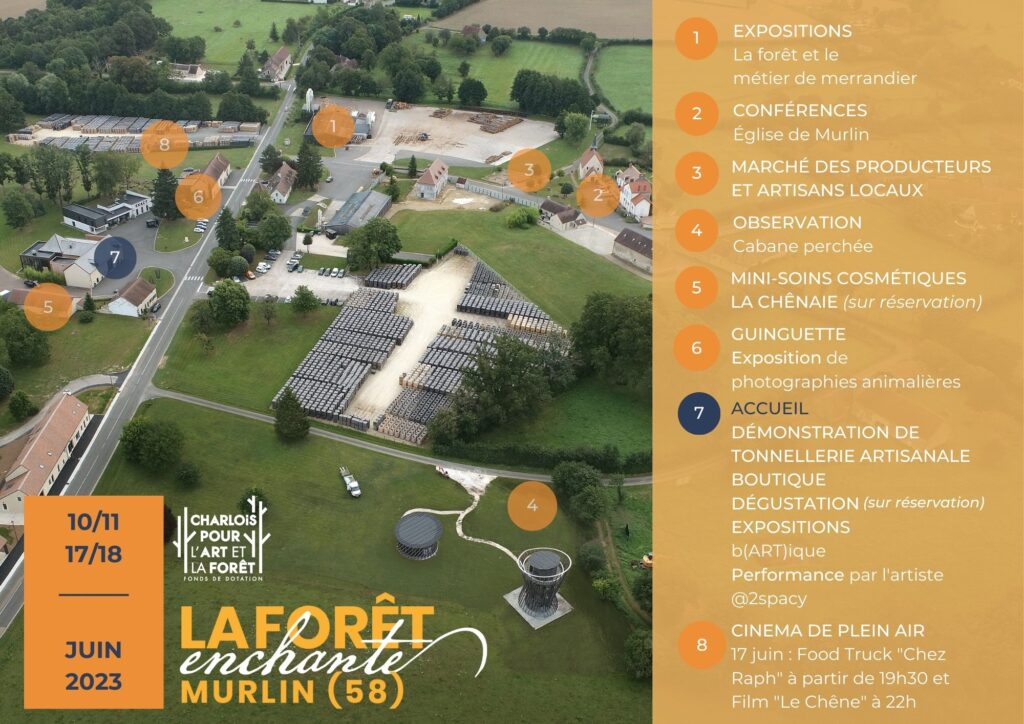 Le village de Murlin sera ainsi, le temps de deux week-ends (10/11 et 17/18 juin), l’épicentre nivernais du festival des Nuits des forêts à travers des démonstrations de tonnellerie, des conférences, des expositions, des performances artistiques, des ateliers de dégustation pour comprendre les apports du chêne au vin, des mini-soins La Chênaie, un marché de producteurs et d’artisans locaux, une projection en plein air du film Le Chêne de Laurent Charbonnier et Michel Seydoux…