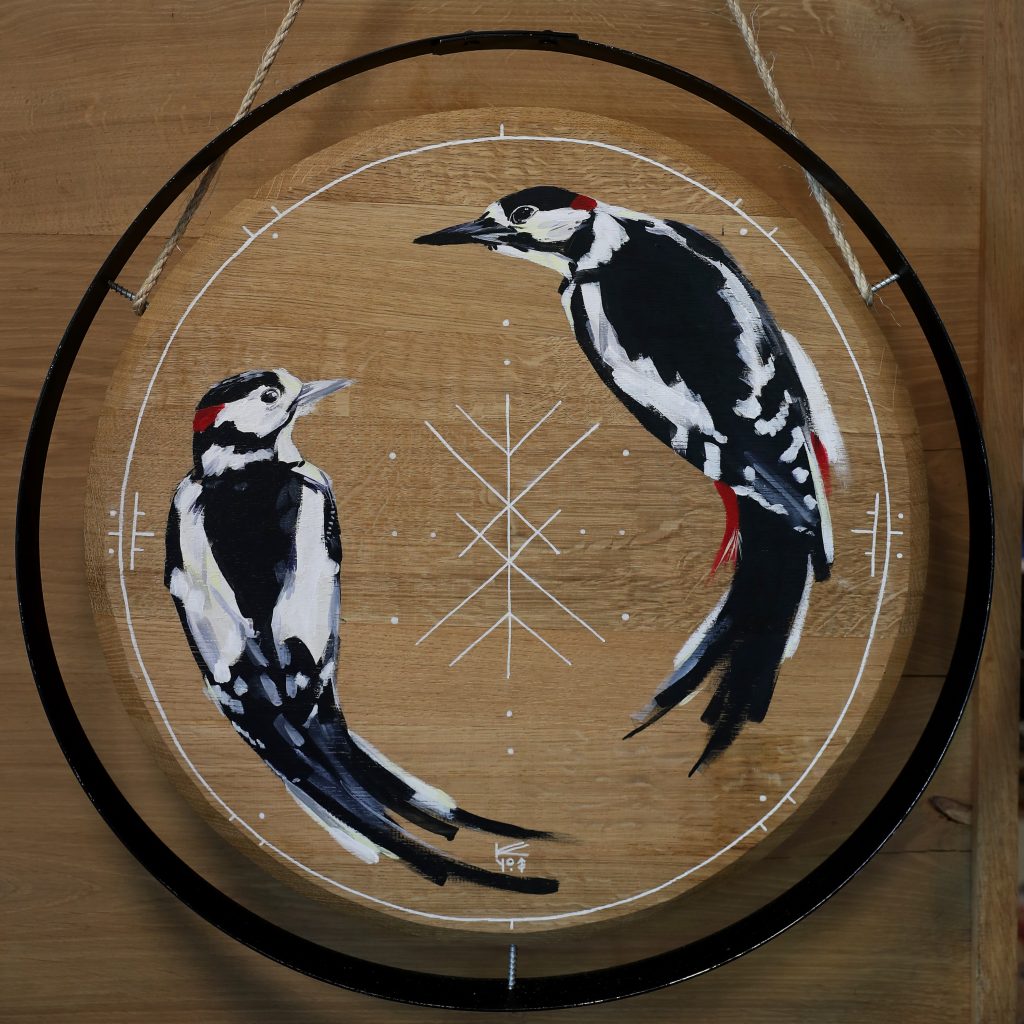 Fond de barrique « Pics épeiches » décoré à l’acrylique et aux marqueurs par K.Yoô (2022).