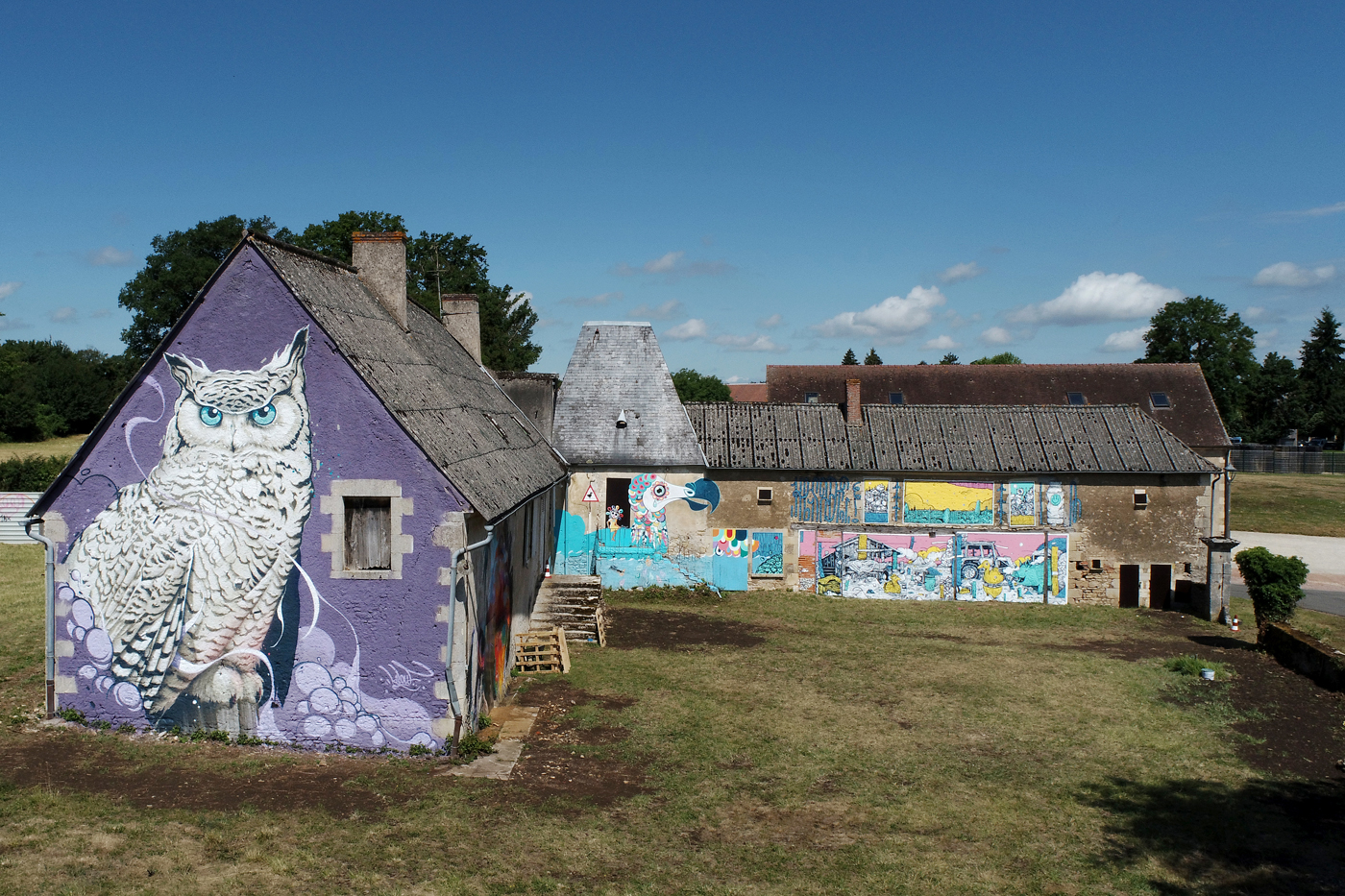 Deux semaines d’interventions, 9 street artistes de renom pour redonner vie aux façades d’une maison du bourg de Murlin. À travers la réalisation d’œuvres picturales monumentales inspirées par la nature, la forêt et son étonnante biodiversité qui ont ravi les centaines de visiteurs du festival « La forêt enchante Murlin ».